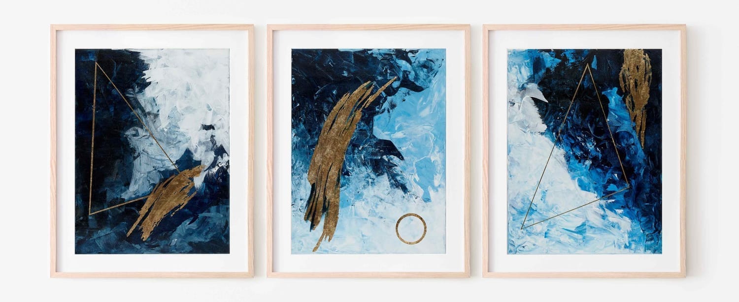 Many originals have sold, but you can still collect various series in beautiful print form. Crisp, immersive, energetic gold leaf textures, brushwork and ink work bounce off high quality paper with vibrant colors.